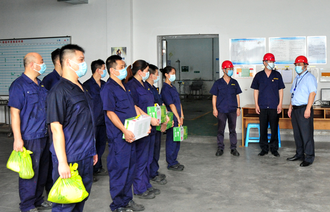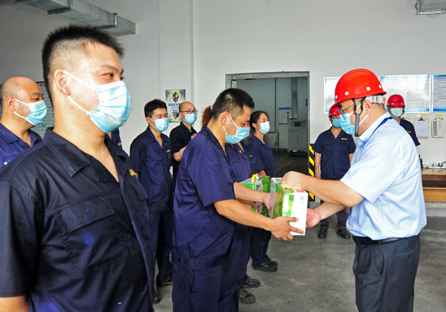 進入盛夏以來持續高溫,為向堅守崗位的一線職工表達敬意和關懷。8月2日上午,集團黨委書記、董事長楊龍一行人來我公司慰問高溫工作環境下的一線員工,公司黨委書記胡傳法、副總經理張華衛陪同。 楊龍董事長親臨8期組件現場,給奮戰在高溫一線的員工帶來了牛奶、綠豆等解暑物品,并對一線員工的工作付出給予肯定。