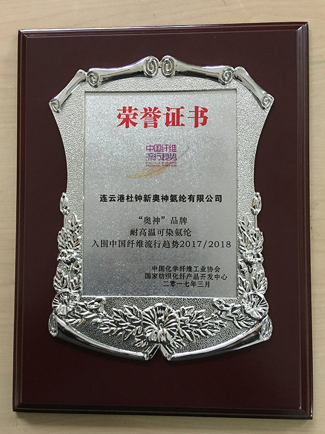 近年來,氨綸公司緊緊把握流行趨勢,緊跟時代步伐,牢固樹立以“新品研發促企業發展”的戰略目標,將新品研發作為企業發展的核心,不斷加大研發投入,陸續開發出超柔、耐高溫、有色、衛材等多系列產品,多項產品處于同行業前列。此次,氨綸公司“奧神”品牌耐高溫可染氨綸成功入圍“中國纖維流行趨勢2017/2018”,再次證明了我公司在新品研發和把握市場方面的實力,也進一步擴大了“奧神”品牌的影響力。