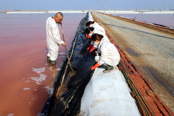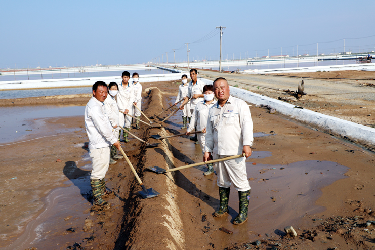 趁著休息的間隙,筆者與身邊忙得滿頭大汗的8班班長祝星星聊了起來。據祝星星介紹,每天員工4點半就到灘頭,進行鹽池的人工活碴、稟基修復、鹽池鹵水補充、收放設備檢查等一系列工作,因此,合理安排工作量非常重要。他告訴筆者,室外工作工人的勞保服比較厚,一天下來工作服濕了又干,干了又濕,衣服上都泛出厚厚的鹽漬。一天下來,全班要消耗2大桶甚至更多的飲用水?,F在公司里對我們一線生產崗位員工非常關心,防暑降溫工作非常到位。最近,單位又為我們發放高溫津貼、電風扇、防暑降溫藥品。這些讓我們員工真切感受到組織的力量,組織得偉大,所以雖說現在比平時更辛苦,我們有信心戰高溫、奪高產。