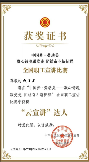 近日,全國總工會公布了“中國夢·勞動美——凝心聚魂跟黨走 團結奮斗新征程”全國職工“云宣講”比賽結果,我公司勞模祝星星同志喜獲“云宣講”達人稱號。