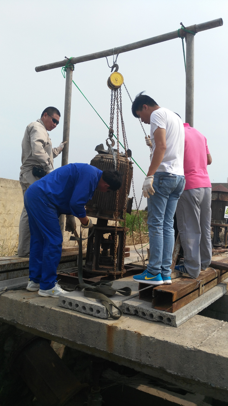 隨著氣溫升高,養殖淡水需求量增大,機泵高負荷運行,損壞率增大。日前大河處于低水位期,機電服務公司抓住當前有利時機,積極組織人力對炅威3臺淡水機泵進行搶修。與雇傭蛙人潛水修理相比,節約費用3000元。(機電服務公司)