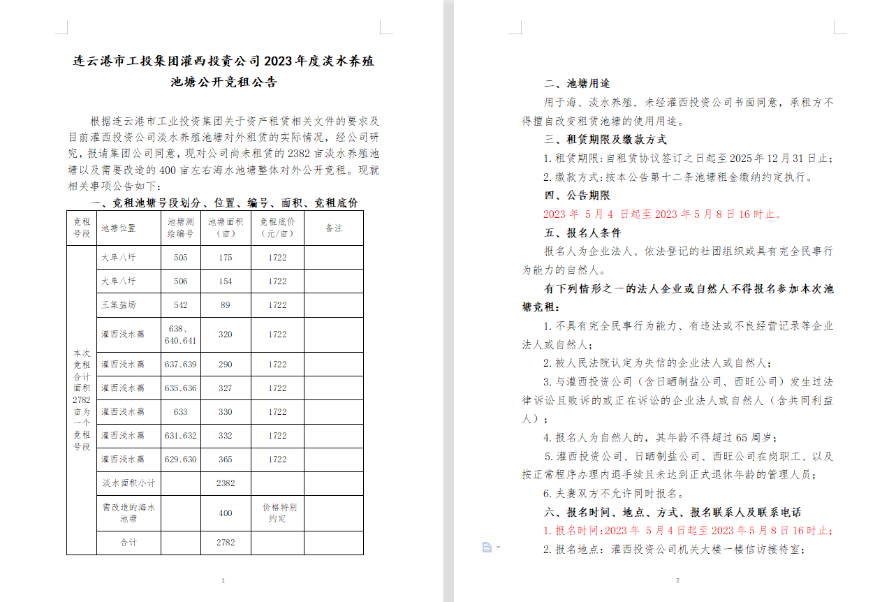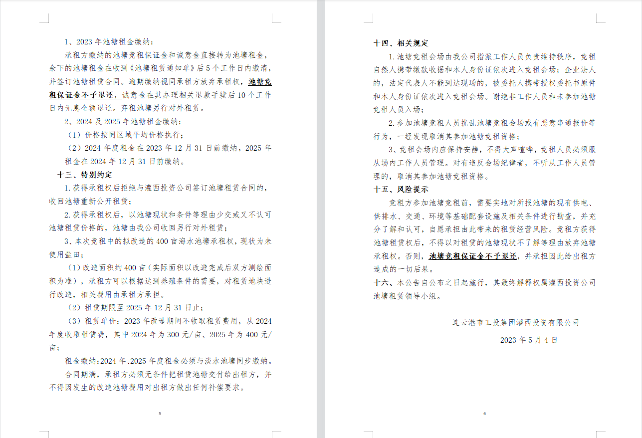 連云港市工投集團灌西投資公司2023年度淡水養殖池塘公開競租公告