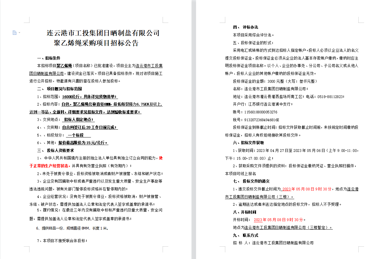 連云港市工投集團(tuán)日曬制鹽有限公司聚乙烯繩采購(gòu)項(xiàng)目招標(biāo)公告