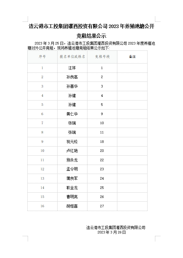 連云港市工投集團(tuán)灌西投資有限公司2023年養(yǎng)殖池塘公開(kāi)競(jìng)租結(jié)果公示