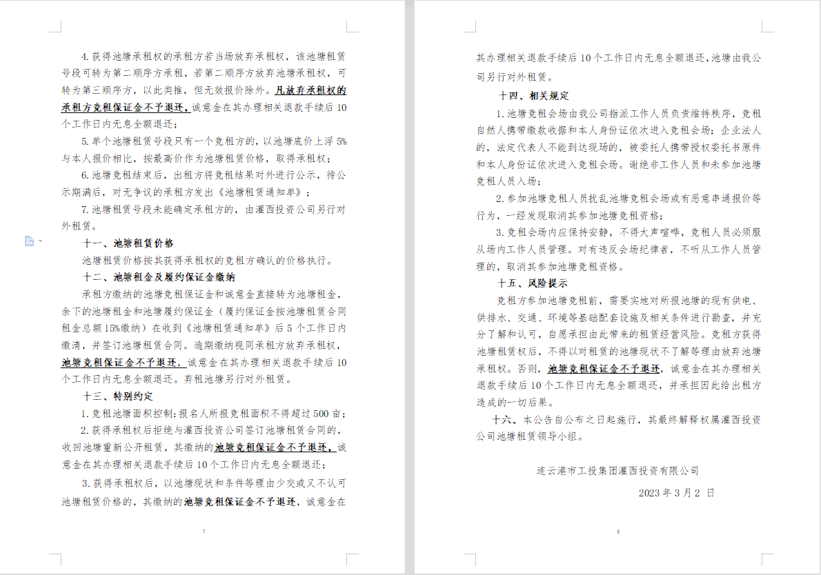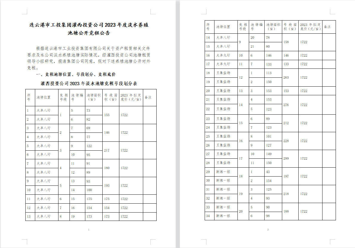 連云港市工投集團灌西投資公司2023年度淡水養殖池塘公開競租公告