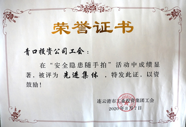 ? 集團公司工會5月以來開展了“安全隱患隨手拍,合保安康你我他”為主題的“安全隱患隨手拍”活動,青口工會廣泛宣傳,組織廣大職工積極參與,期間共收到職工“隨手拍”作品近二十件,并上報集團公司參加比賽,經上級專家評審,我公司工會被評為“先進集體”,鄭江作品《安全線》獲得優秀作品獎。