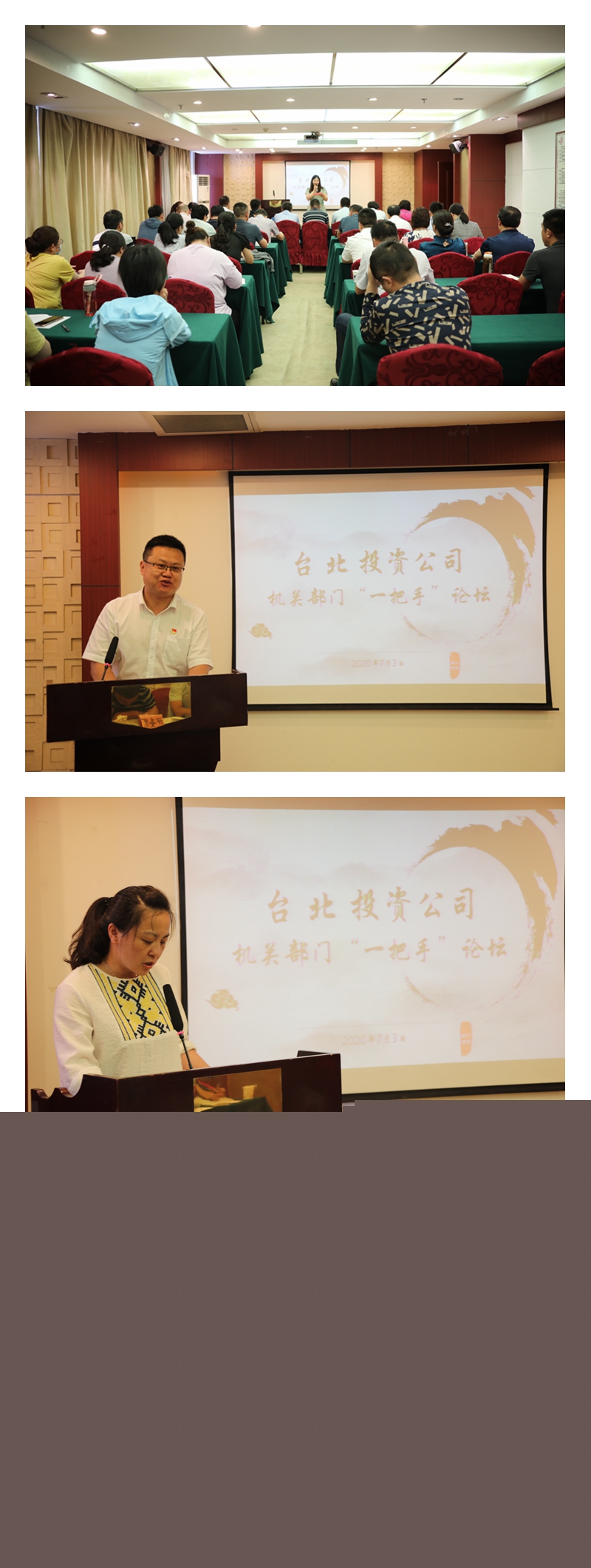 7月3日下午,投資公司在九樓會議室舉辦臺北大講壇——部門“一把手”專場,來自機關部門的八位同志走上講臺,談心得,談想法,談思路,談措施。公司領導、各單位黨政負責人、機關部門部分人員參加了講壇。本次講壇由各基層單位主要負責人作為評委。