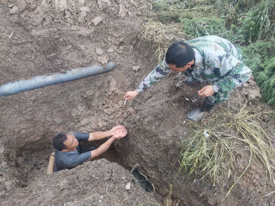 泵站是大浦工區(qū)的命脈,也是生存之源。泵站三人組席強(qiáng)余、喬效富、龔大春憑著敏銳的洞察力,迅速關(guān)掉閥門,帶上工具,立刻出發(fā)排查檢修輸鹵管道。由于昨夜突降暴雨,地面潮濕,給排查工作帶來了相當(dāng)大的困難,三人組按照多年的工作經(jīng)驗,當(dāng)機(jī)立斷,分工分路段進(jìn)行排查,與時間賽跑,早點找到損壞的管道就能減少鹵水的損失。經(jīng)過三人精心細(xì)致的排查,徒步六公里,終于在臺北汽車城一處雜草叢生的區(qū)域發(fā)現(xiàn)了損壞的管道,此處管道是掩埋在泥土里面,修復(fù)起來難度更大,三人立即拿起鐵锨開挖,席強(qiáng)余顧不上管道溝里齊膝渾濁的雨水,穿著膠鞋就淌進(jìn)溝里,坐騎在管道上,雙手伸進(jìn)水里,嫻熟的進(jìn)行修復(fù)。經(jīng)過近兩個小時的維修,管道恢復(fù)正常供鹵,大程度減少了鹵水損失,為原鹽順利生產(chǎn)提供了堅強(qiáng)有力的保障。