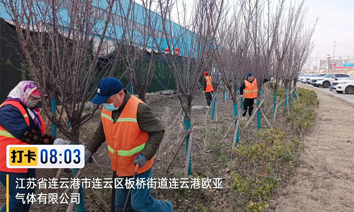 實時拆除防寒設施。隨著氣溫的逐漸升高,為使苗木更好、更快的返青,前期瑞南二個綠化班組緊鑼密鼓,積極準備,搶抓時機,3月中旬對云港路、金港路、228等道路兩側夾竹桃等綠植防寒草簾進行拆除工作,并對去冬枯枝干葉安排修剪。
